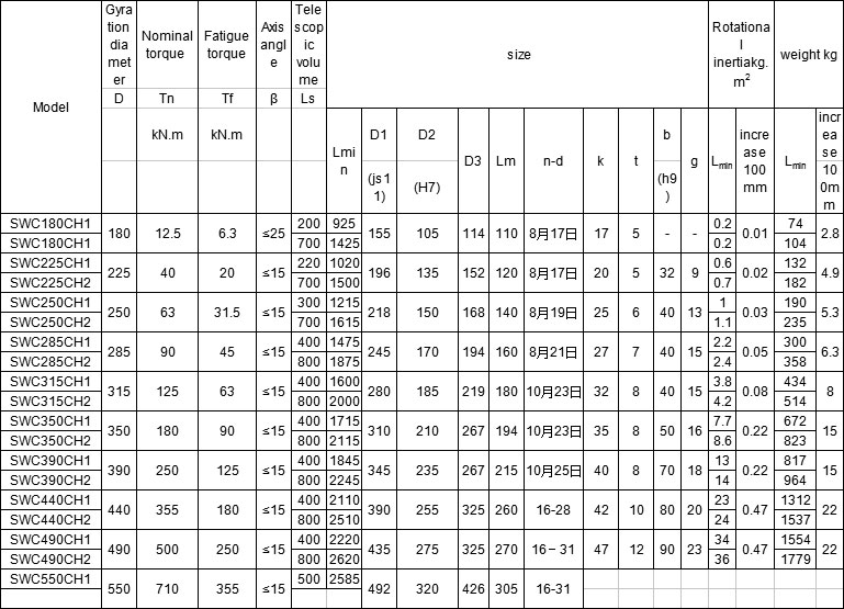 SWC-CH type coupling characteristics and application: connecting two different axes of the shaft drive, can not buffer, reduce vibration, using the overall fork structure, the bearing is fixed without bolts, avoid loose loosening of the bolt, easy to repair, extended use It has long life, high reliability, large bearing capacity and large inclination. It can work under the condition of β≤5°~25°. Suitable for rolling machinery, lifting and transportation, construction machinery, petroleum machinery and other heavy machinery. There are seven structural types to meet different installation types: BH type - standard telescopic welding type; BF type - standard telescopic flange type; DH type--short telescopic welding type; CH type - long telescopic welding type; WH type - no telescopic welding type; WF type - no telescopic flange type; WD type - no telescopic short type; ![]() ![]() |