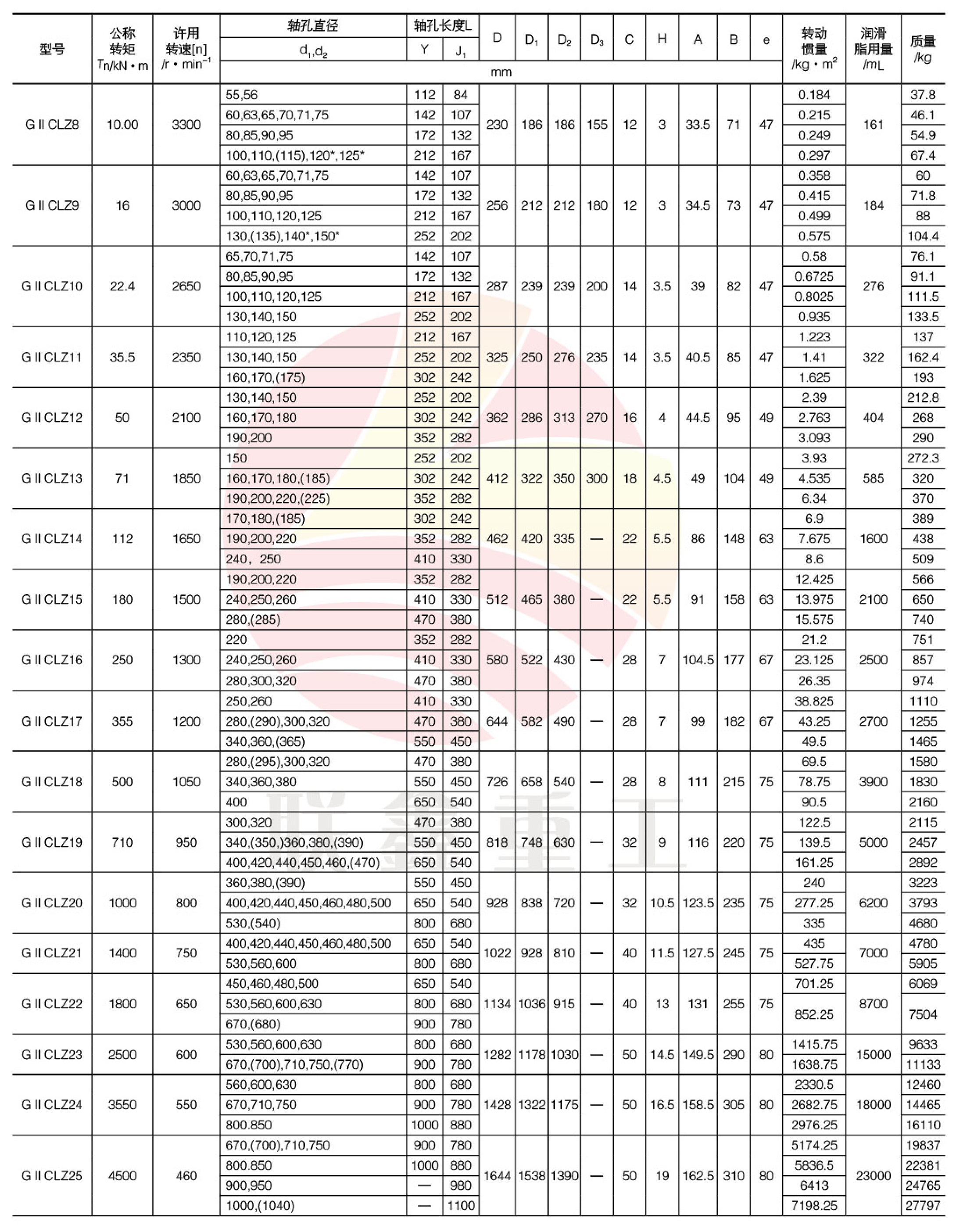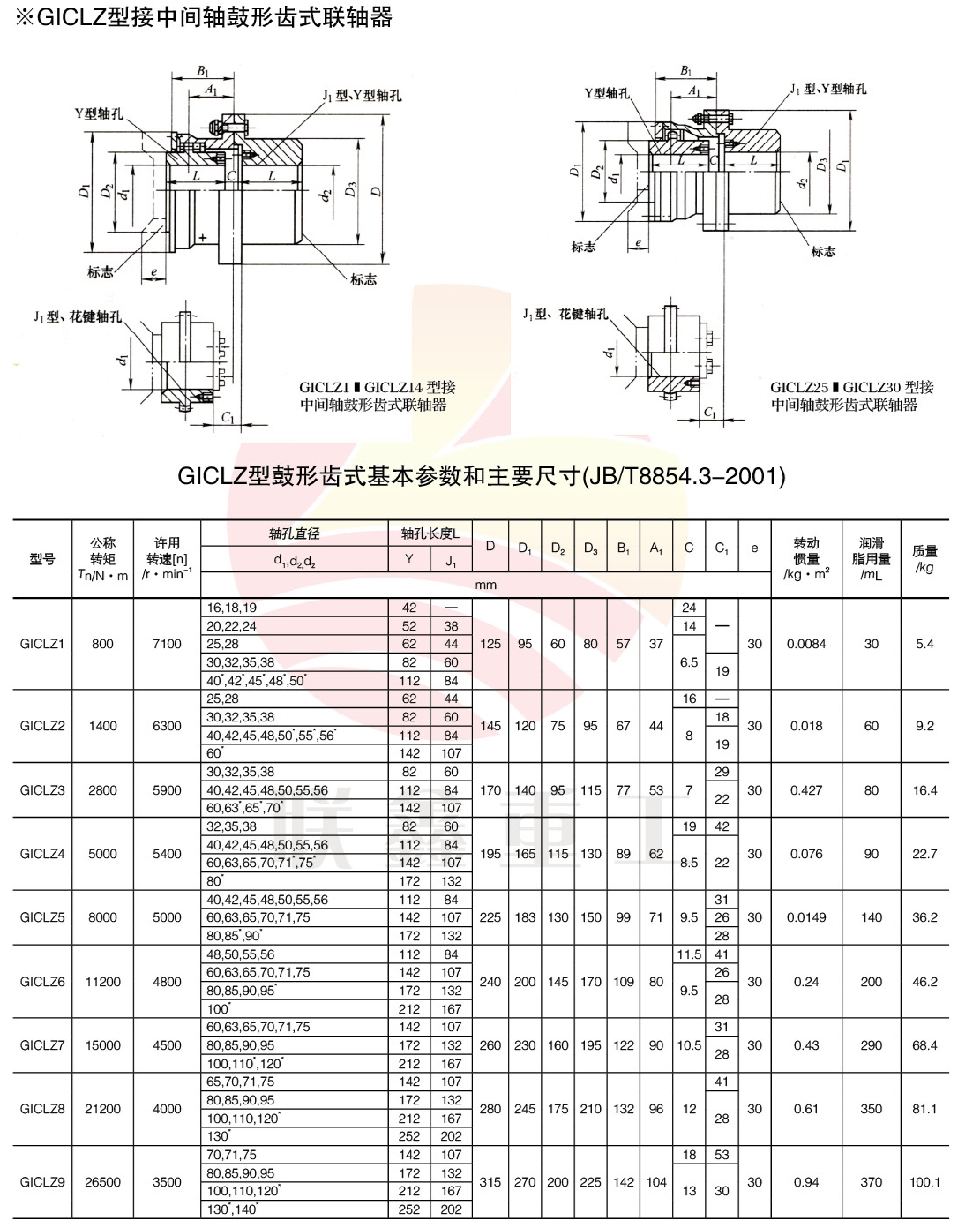 GICLZ型鼓形齿式DAJIANG.COM_大江(中国) 特点及应用场合:具有少量轴线偏移补偿性能,不能缓冲、减振。外形尺寸小,理论上传递转矩大,需要润滑、密封,但噪声较大、价格贵,用于联接水平两同轴线轴系传动。用于低速、重载工况条件下联接水平两同轴线,如冶金机械、重型机械等。不适用于高速、高精度的轴系传动,起动频繁、正反转多变的工况不宜采用。