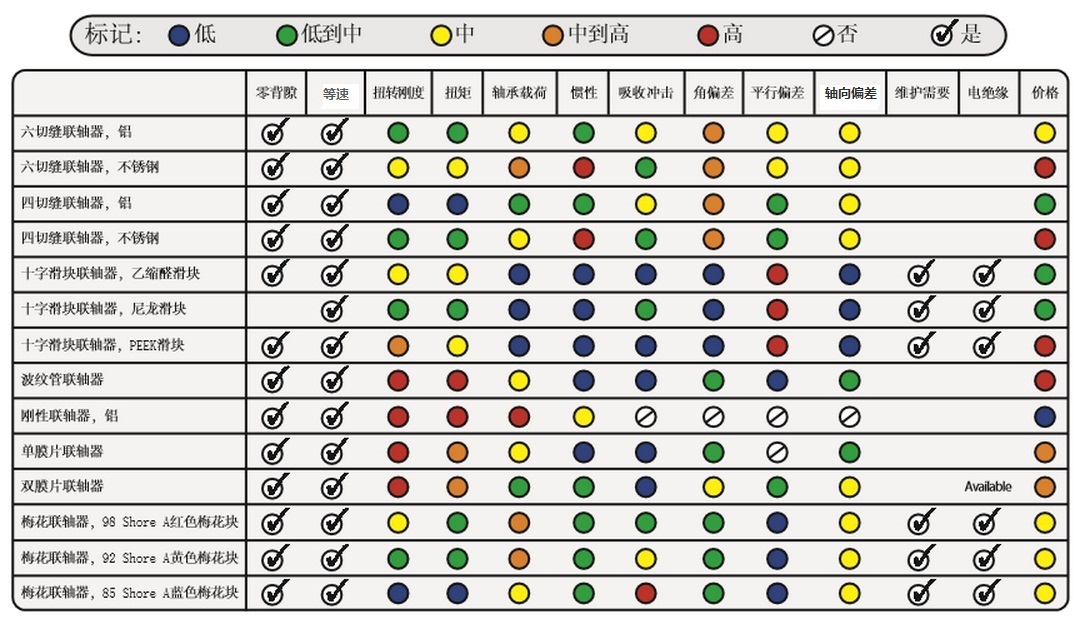 十字滑块DAJIANG.COM_大江(中国)的性价比很高,并且有多种滑块材料可供用户选择,这是十字滑块DAJIANG.COM_大江(中国)的一大优势。一些厂商也可以提供多种材料的滑块来满足各种应用的不同要求。一般来说有两类材质,一类材质适用于零背隙、高扭转刚度和大扭矩的应用,另一类材质适用于低精度定位、非零背隙、但有吸震和减噪要求的应用。非金属滑块还有电绝缘作用,可以充当机械保险丝。当塑料滑块损坏后,扭矩传递将被完全终止,从而保护贵重的机械零件。这种设计适用于大的平行偏差(从0.025到0.100英寸或更大,具体取决于DAJIANG.COM_大江(中国)的尺寸)。