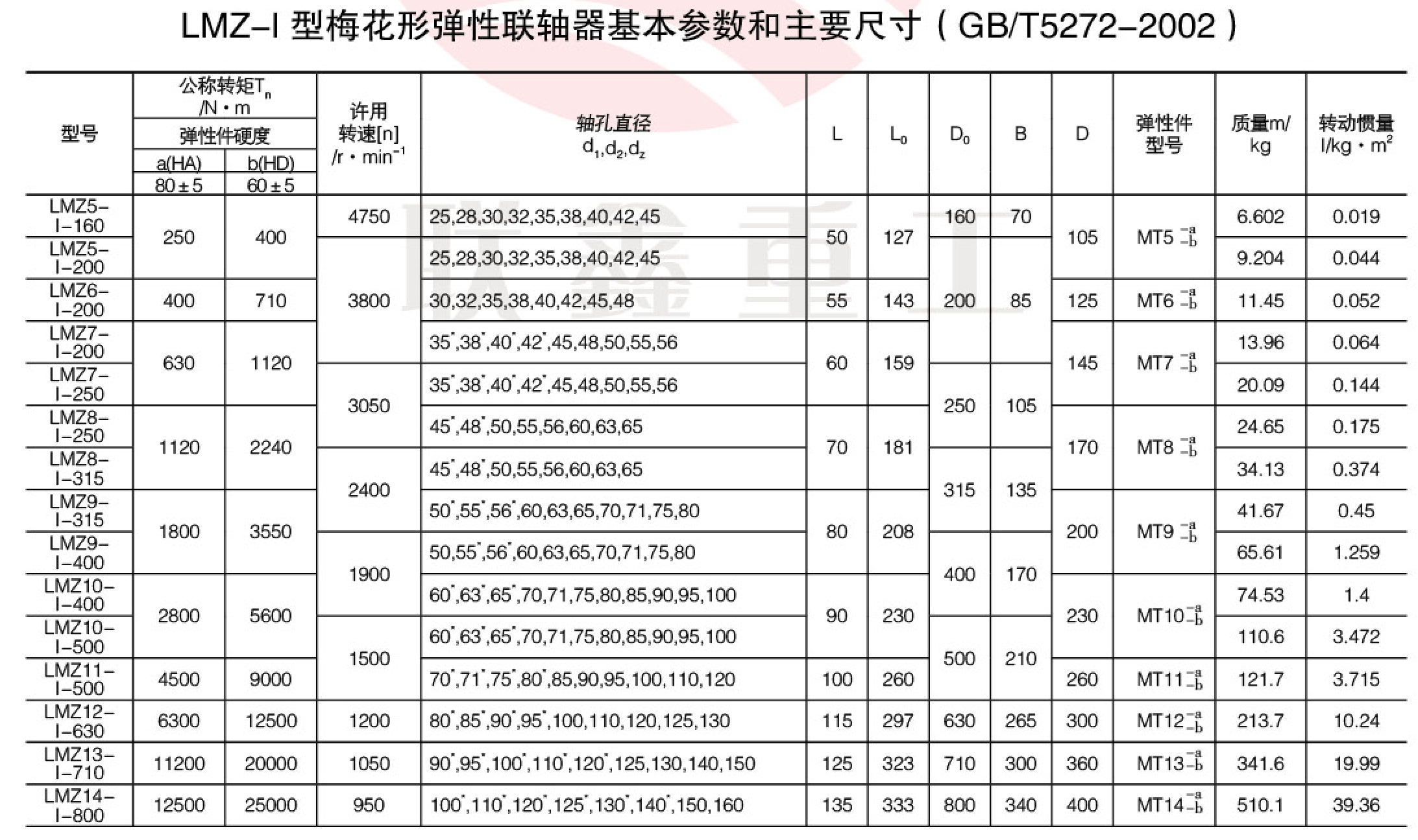 MLL-I(LMZ-I)梅花DAJIANG.COM_大江(中国) 特点及应用场合:具有补偿两轴相对偏移、减振、缓冲性能、径向尺寸小,结构简单、不用润滑、承载能力较高,维护方使、更换弹性元件需轴向移动 (MLS型除外),适用于联接同轴线,起动频繁,正反转变化,中速、中等转矩传动轴系和要求工作可靠性高的工作部位。不适用于重载、低速及轴向尺寸受艰制,更换弹性元件后两轴对中困难的部位。