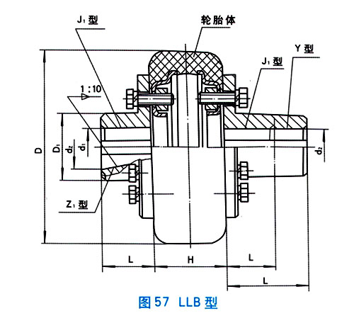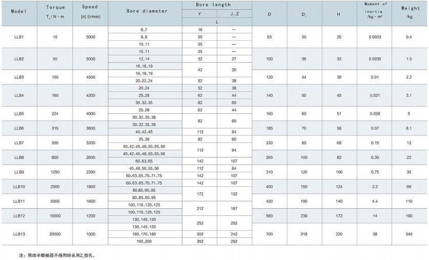 Basic parameters and main dimensions of LLB tire coupling: Specification LLb1-13, nominal torque 10-20000, permissible rotational speed 5000-1000, shaft hole diameter 6-200, shaft hole length 16-352, weight 0.4-340 , material cast steel joint, rubber tire body.